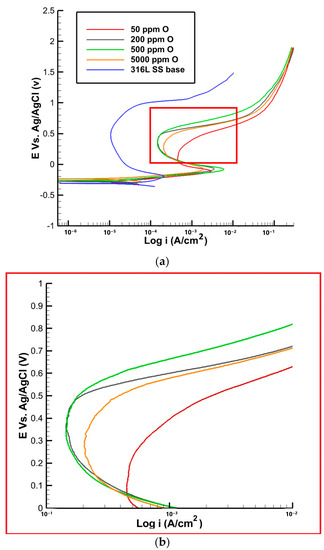 (a) Polarization curve of 316L SS with varying oxygen content, (b) high magnification of the red area in the plot (a).