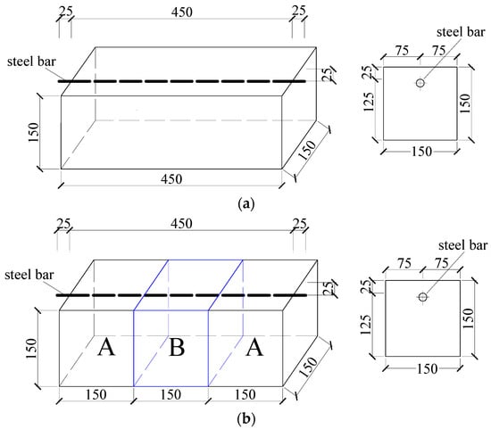 In this study, both monolithic and segmental specimens with new-to-old concrete interfaces were fabricated, as shown in Figure 1. The size of all specimens was 150 × 150 × 450 mm and each specimen was reinforced with one 16 mm steel bar with a net cover depth of 25 mm. For the segmental specimens, as shown in Figure 2, in addition to a prefabricated wooden mold with a size of 150 × 150 × 450 mm, a cubic foam mold with a size of 150 × 150 × 150 mm was also prepared. Holes were first drilled on both the foam and wooden molds according to the rebar diameter and concrete cover thickness, and then the foam mold was placed at the location of part B. A 500 mm long steel bar, which had been manually de-rusted and weighed, was then passed through the channel with a length of 25 mm exposed on both sides of the wooden formwork. The wires were welded at the end of the steel bar and epoxy resin was also applied to a range of 25 mm at both ends of the steel bar to seal them from corrosion. Two parts, which were denoted as part A, as shown in Figure 1b, corresponding to the old concrete, were cast in the first stage. Ten days later, the foam mold in part B was taken out, and the new-to-old concrete surface was manually roughened. After the roughening was completed, the remaining part of the specimen (i.e., part B), corresponding to the new concrete, was cast, and then both the new and old concrete was cured for 28 days.