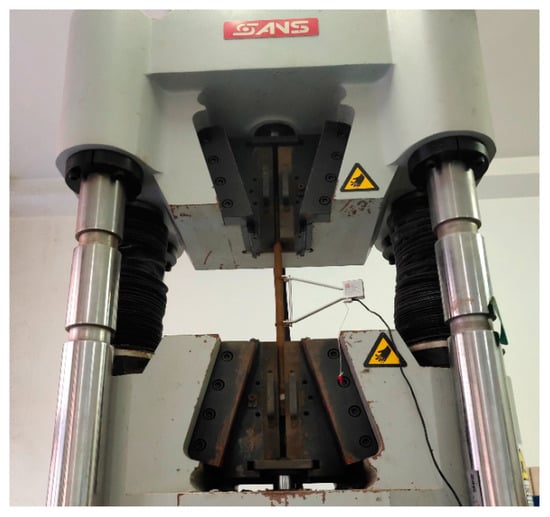 After evaluating the corrosion levels, the corroded bars were subjected to strain-rate-controlled tensile testing according to the standard code GB/T 288.1-2021 [] using an electro-hydraulic servo universal testing machine (see Figure 5). During the tensile test, the applied load and deformation data were collected through a computerized data acquisition system.