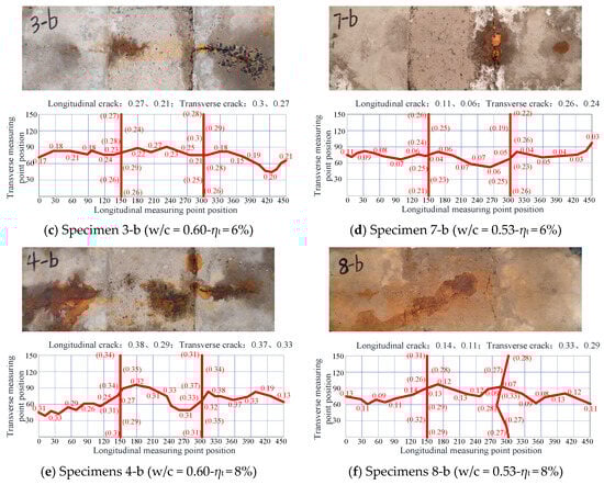 Figure 6 shows the crack map on the exposed concrete surface when the monolithic ordinary concrete Specimens 1-b (w/c = 0.60) and 5-b (w/c = 0.53) reached 4%, 6%, and 8% theoretical corrosion rates from Faraday’s Law, respectively. As the rust expansion cracks were very tiny, in this study, not only are the actual crack photos given in Figure 6, but the grids are also introduced to describe the crack development, and the maximum and average values of crack widths are marked in the upper-left corner of the grids. It was found that, when the theoretical corrosion rate of steel bars reached 4%, the rust expansion cracks of the ordinary concrete monolithic Specimens 1-b and 5-b penetrated the entire concrete surface, and a small number of rust products overflowed. The maximum longitudinal crack widths of Specimens 1-b and 5-b were 0.16 and 0.12 mm, respectively. When the theoretical corrosion rate reached 6%, more rust appeared on the surfaces of Specimens 1-b and 5-b, and the longitudinal cracks further developed. The maximum longitudinal crack widths of Specimens 1-b and 5-b were 0.28 and 0.24 mm, respectively. When the theoretical corrosion rate reached 8%, the corrosion products were densely spread on the entire surface, and the maximum longitudinal crack widths of Specimens 1-b and 5-b were very close to one another, with values of 0.37 and 0.39 mm, respectively. In general, the average crack widths of Specimen 1-b (w/c = 0.60 concrete) at 4%, 6%, and 8% theoretical corrosion rates were 0.13, 0.24, and 0.31 mm, respectively, which were typically larger than those of Specimen 5-b (w/c = 0.53 concrete; 0.08, 0.19, and 0.28 mm, respectively).