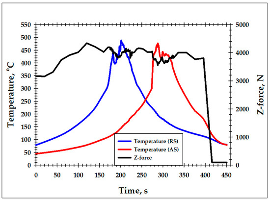 The FSW thermal cycles recorded at the retreating side (RS) and the advancing side (AS) and the evolution of Z-force during FSW.