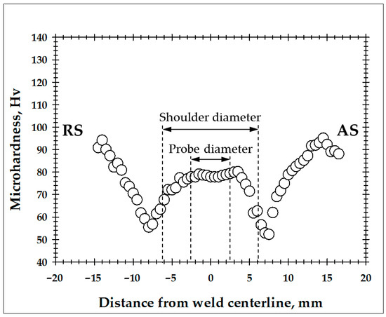In order to identify the microstructural zones produced during FSW, a microhardness profile was measured across the welded joint, as shown in Figure 2. For clarity, the dimensions of the tool probe and the tool shoulder were also indicated. In a first approximation, those point to the heat-affected zone and the stir zone, respectively.