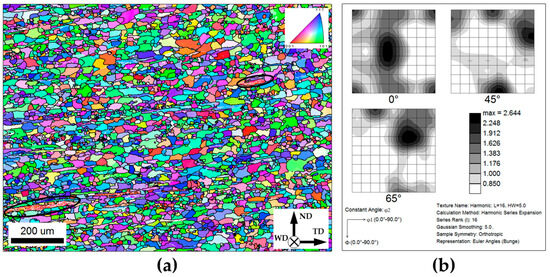 In order to get additional insight into the recrystallization process, the evolved crystallographic texture was also analyzed. To this end, orientation data were derived from the EBSD map and arranged as an orientation distribution function (ODF). The characteristic sections of the ODF are shown in Figure 3b, while the volume fractions of the dominant texture components are summarized in Table 2. It is seen that the static recrystallization retained the initial rolling texture but reduced its intensity.