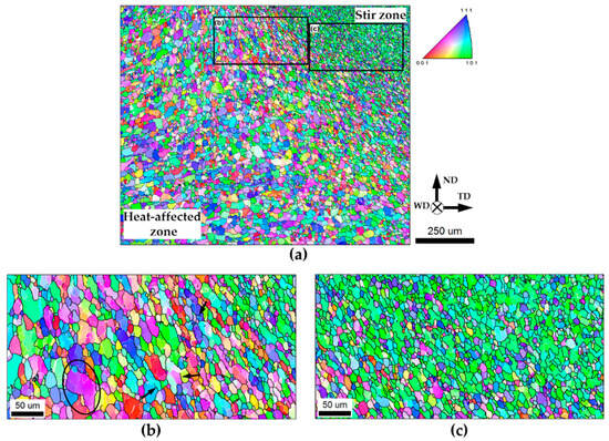 The EBSD orientation map taken from a transition region between the heat-affected zone and the stir zone is shown in Figure 4a. The selected areas of the map are given at higher magnifications in Figure 4b,c. Again, individual grains in all cases were colored according to their crystallographic orientations relative to the welding direction, and LABs and HABs are depicted as white and black lines, respectively.