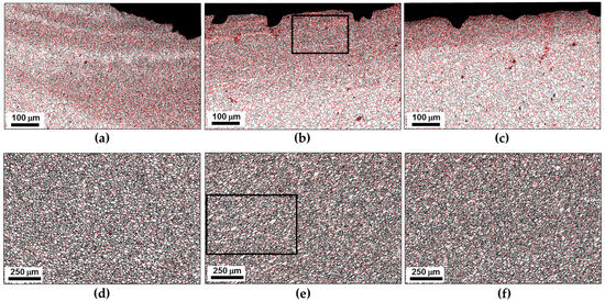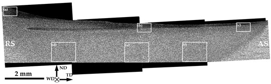 In order to get a closer inspection of the evolved microstructures, several local areas of the sample-scale map in Figure 5 were given at higher magnifications in Figure 6. The grain-size statistics derived from these areas are summarized in Figure 7. It is seen that the fine-grained surface layer was most pronounced at the retreating side of the stir zone (Figure 6a) but tended to narrow towards the advancing side (Figure 6b,c). Moreover, a subtle decrease in the average grain size was also found (Figure 7a). In contrast, the grain size in the nugget zone was relatively stable (Figure 7b), and no significant changes in microstructure morphology were found (Figure 6d–f).