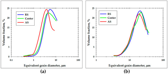 Grain-size distributions measured in different locations of the stir zone: (a) upper surface and (b) weld nugget. Note: The grain size data were derived from EBSD maps shown in Figure 6.