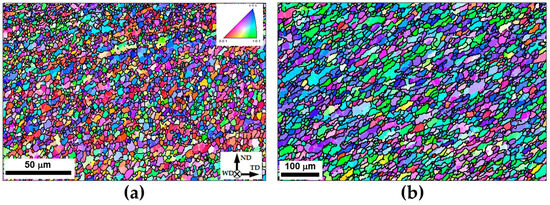 The EBSD orientation map taken approximately beneath the shoulder edge is shown in Figure 3a. The individual grains in the map are colored according to their crystallographic orientations relative to the welding direction (the color code triangle is shown in the top right corner), while LABs and HABs are depicted as white and black lines, respectively.