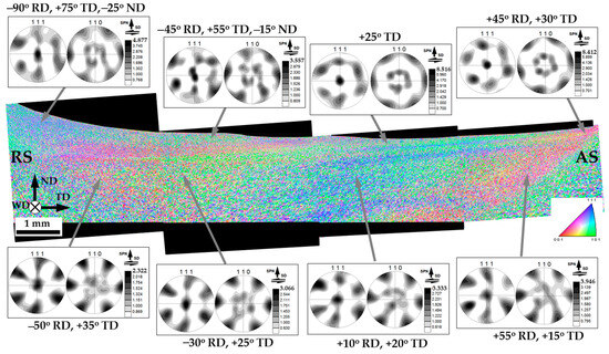 Hence, the measured pole figures were appropriately rotated to align their geometry with the presumed geometry of local shear strain. The rotated pole figures are shown in Figure 10. The applied rotations were indicated beneath the pole figures.