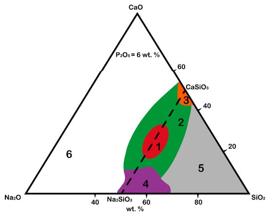 The original idea of Larry Hench was to combine the elements that a human body is replete with in proportions that facilitate the rapid release of alkalis from the glass surface in aqueous solutions, followed by the formation of layers rich in calcium and phosphorus. Thus, the Na2O–CaO–SiO2 system was chosen as a base, to which phosphorus oxide (P2O5) was also added in small amounts (6 wt.%) since it was believed that its presence in glass or ceramics was critical to the bioactivity of the material at the time [24]. However, the development of modern approaches to obtaining an “ideal” biomaterial has shown that phosphate-free glasses and ceramics also have bioactivity [25,26]. For instance, calcium silicate (CaSiO3) bioceramics have significantly greater osteoinductive capacity, and it has been observed both in vitro and in vivo compared with tricalcium phosphate [25]. Calcium silicate extract promoted macrophage polarization, thus reducing the host-to-material inflammatory response. In addition, after stimulation by a macrophage-conditioned medium pretreated by calcium silicate extracts, the osteogenic differentiation of bone marrow stromal cells (BMSCs) was greatly enhanced by macrophage-derived oncostatin M [25]. Nevertheless, phosphorus oxide plays a specific role in the composition of the material (it accelerates the formation of hydroxyapatite and hydroxyl carbonate apatite layers on the surface of the material), so its presence is desirable in the final product. Thus, the Na2O–CaO–SiO2–P2O5 system can be schematically presented in a Na2O–CaO–SiO2 phase diagram (Figure 1) with the fixed mass value of P2O5 equal to 6 wt.% [17].