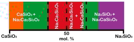 The pseudo-binary Na2SiO3–CaSiO3 system includes five crystalline phases [49]: CaSiO3 (wollastonite (β-CaSiO3), JCPDS 43-1460, and pseudowollastonite (α-CaSiO3), JCPDS 31-300), Na2O·CaO·2SiO2 (112, JCPDS 77-2189), Na2O·2CaO·3SiO2 (123, combeite, JCPDS 75-1686), 2Na2O·CaO·3SiO2 (213, JCPDS 37-0282), and Na2SiO3 (JCPDS 16-0818).