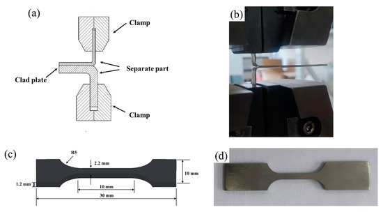 The analysis of the morphology of the bonding interface, peeling surface and tensile fracture was conducted using a SHIMADZU EPMA-8050G electron probe micro-analyzer (EPMA) equipped with an energy-dispersive spectrometer (EDS). In order to examine the diffusion of elements at the interface, an electron probe micro-analyzer (EPMA) model JEOL JXA-8530F (Tokyo, Japan) was employed. The EPMA operated at an acceleration voltage of 20 kV and a sample current of 2 × 10−8 amperes. In order to evaluate the adhesive strength and tensile characteristics, a T-type peeling test and a tensile test were conducted using a TH5000 universal testing machine (Tianhui Machinery Co., Ltd., Yangzhou, China). The tests were performed at room temperature with a crosshead speed of 3 mm/min. The standard reference for tensile tests at room temperature is GB/T228.1-2021 [17]. The tensile rate was the same as the peel test rate. Figure 3 depicts images illustrating the peeling test and tensile test sample.