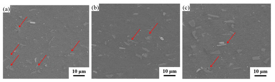 As shown in Figure 4, SEM images of Al–SiC powder casing with different particle sizes after annealing of the sealed pipe show that SiC particles are unevenly dispersed in the Al matrix, and obvious SiC agglomeration can be detected in the Al matrix, corresponding to the red arrow mark. In Figure 4a, the agglomeration of SiC particles at 0.5 µm was more significant, and the agglomeration decreased significantly with increasing SiC particle size (Figure 4b,c). When the SiC particles are small, the specific surface area is large, the surface activity is high, the fluidity is good and the agglomeration is easily affected by van der Waals forces. The agglomeration of SiC in the matrix is influenced by the ratio of matrix to reinforced particle size, and a decrease in this ratio has been found to mitigate the incidence of agglomeration [18]. Consequently, the introduction of a higher concentration of SiC particles has been observed to have a notable effect on mitigating the agglomeration of SiC within the matrix.