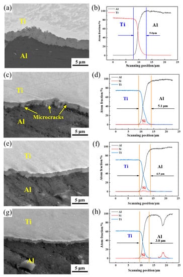 Figure 5 shows the EPMA interface morphology and element distribution of the Ti/Al–SiC/Ti composite plate. Figure 5b,d,f,h indicates that the thickness of the interfacial diffusion layer of the composite plate gradually decreases with increasing SiC particle size, but the Ti/Al–SiC interface morphology becomes increasingly uniform and continuous. Nano-SiC particles easily form agglomerations. However, compared with large SiC particles, nanoscale particles have a relatively weak hindering effect on the element diffusion of Ti/Al. H.T. Gao studied the influence of SiC particle size on the morphology of the Cu/Al interface and observed similar phenomena [12]. S. Yan et al. found that the reduction of SiC particles, coupled with higher thermal residual stress and larger surface area, led to a decrease in the thermal expansion coefficient of the intermetallic compound layer and the thermal conductivity of Ti/Al [19]. As a result, the intermetallic compound layer became narrower and more uniform. In addition, there are some small cracks in IMCs because, during the rolling process, the TiAl3 intermetallic compound layer with poor toughness undergoes brittle fracturing under a high compression rate, and excessive local stress concentration also leads to cracks. There is an obvious stress concentration at the interface of Ti and Al–SiC. This phenomenon can be attributed to the thermal expansion coefficient (SiC ≈ 3.8 × 10−6, Ti ≈ 10.03~9.41 × 10−6, Al ≈ 23.1 × 10−6) and elastic modulus (SiC ≈ 475 GPa, Ti ≈ 106.4 GPa) of SiC particles, significantly different from that of Ti and Al substrates. After cooling to room temperature following hot rolling, this difference results in a significant concentration of stress at the interface of the composite.