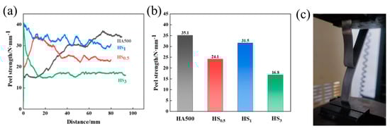 Figure 6 shows the Ti/Al–SiC/Ti peel strength curve and the average peel strength. Figure 6a shows that the initial peeling strength of the composite plate with SiC particles added is higher than that of the composite plate without SiC reinforcement, indicating that SiC has an excellent interface-strengthening effect. Among the SiC-reinforced composite plates, HS0.5 has the lowest initial peel strength due to microcracks in the intermetallic compound layer that worsen the bonding strength of the interface. As shown in Figure 5c, the thicker intermetallic compound layer delays crack propagation, and the peel strength increases significantly with increasing peel distance. The stripping force exhibits a linear reduction within the stripping distance range of 0 to 20 mm, indicating a favorable bonding force at the interface of the Ti/Al–SiC composite. As the stripping distance is extended, there is a noticeable trend of gradual variation in the stripping force. This suggests that the intermetallic compound layers present at the Ti/Al interface of the HS3 sample exhibit a continuous bonding behavior. HS3 has an initial peeling strength similar to that of HS1, indicating that the thin intermetallic compound layer (Figure 5g) can better resist initial tearing. The HS1 sample has the highest initial peeling strength; the peeling distance increases, the peeling strength decreases slightly and some parts of the peeling curve fluctuate, which may be due to local microcrack expansion, but the overall curve changes within a stable range, indicating that an appropriate thickness of the intermetallic compound layer can obtain excellent interfacial bonding strength.