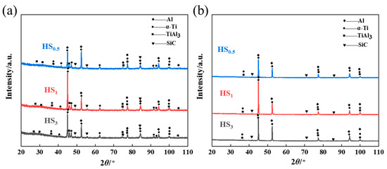- Compared with the HA500 sample, the addition of 6 wt.% SiC particles enhanced the diffusion and thickened the intermetallic compound layer. HS1 corresponds to the best intermetallic compound layer thickness; the cracks are reduced compared to HS0.5, the diffusion layer thickness is greater than HS3 and no cracks or defects appear. The aggregation of nanoscale SiC particles has no significant effect on the obstruction of element diffusion, and the intermetallic compounds in the HS0.5 sample are thicker and have more cracks. The large SiC particle size in HS3 inhibits the diffusion of Ti and Al elements, and the thickness of the intermetallic compound layer is small;