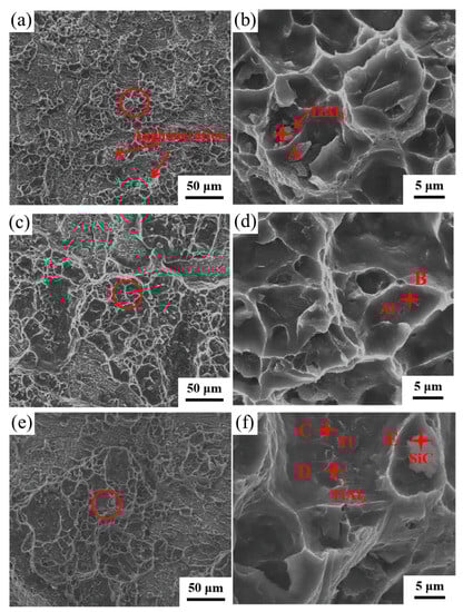 As seen from the tensile fracture morphology of the aluminum matrix of the Ti/Al–SiC/Ti composite plate (Figure 10b,d,f), the partial fracture morphology of HS0.5 shows brittle fracturing and agglomeration. The phenomenon of agglomeration can be effectively mitigated by increasing the size of SiC particles. This is because the agglomeration zone of SiC exhibits limited plasticity, which in turn reduces the co-deformation ability of Ti/Al under axial loading. Consequently, this leads to diminished tensile characteristics, such as in HS0.5. Therefore, during the tensile process, fractures preferably form in this region, and due to the high deformation capacity of the aluminum matrix, this tensile fracture pattern occurs and the matrix exhibits excellent tensile properties (Figure 9a). HS1 and the fracture morphology of the Al matrix of HS3’s increasing litter size increased gradually, and the toughening nest depth and quantity increased. The uniform dispersion of silicon carbide particles was the main cause of this difference.
