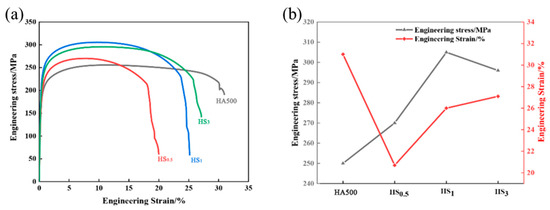 The base materials of HS1 and HS3 exhibit identical plastic characteristics, resulting in comparable fracture morphologies characterized by equal dimensions, depths and a homogeneous distribution of the dimple structure. The metallurgical bonding ability and tensile fracture resistance ability at the Ti/Al–SiC interface during the fabrication of a Ti/Al–SiC/Ti composite plate by the powder-in-tube method can be determined by analyzing the thickness and shape of the intermetallic compound layer. The intermetallic compound layer, as depicted in Figure 5e, exhibits uniformity, completeness and continuity, hence enhancing its capacity for interface bonding and resistance against tensile fracture. Increased presence of microcracks and inadequate metallurgical bonding within the composite material (Figure 5c,g) render it more susceptible to failure under applied loads. Compared with HA500 (Figure 5a), the plasticity of the Al matrix increases, but the fracture of the intermetallic compound layer at the bonding interface decreases the overall plasticity of the clad plate.