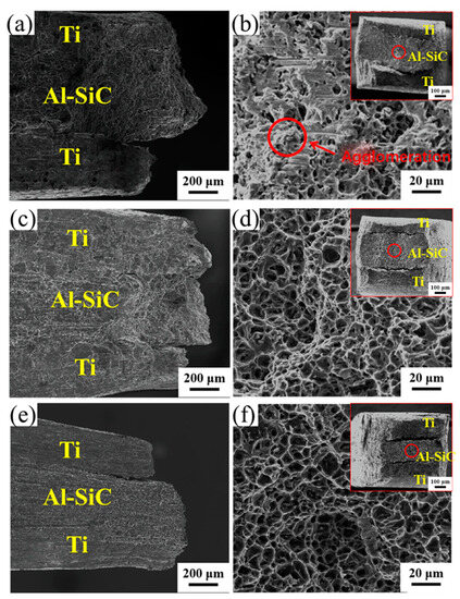 Figure 8 shows the peel interface morphology of the Ti side of Ti/Al/Ti clad plates strengthened with SiC particles of different sizes. In Figure 8a,c,e, it can be observed that the inner surface of the Ti side is bonded to pure Al, which is due to the good consolidation quality of Ti and Al and the high bonding strength between Ti, Al and SiC, resulting in the direct tearing of the inner part of the Al matrix during the stripping test, and part of the pure aluminum is bonded to the Ti matrix. The microstructure also shows that there are dimples on the surface of the Ti matrix (Figure 8b,d,f).