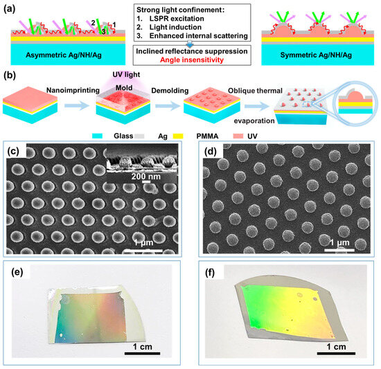 In this work, to achieve incident-angle-insensitive broadband antireflection and absorption, we report on a plasmonic asymmetric nanostructure, which is composed of an asymmetric silver nanoshell and a planar silver film, sandwiching the photoresist nanohemispherical (NH) arrays (Figure 1a), fabricated by combining nanoimprinting lithography and oblique angle deposition. The moth-eye NH arrays with a gradient refractive index create a slowly varied transition from free space into nanostructures, reducing the reflection in the visual light range caused by the abrupt changes in the refractive index [32,33]. The asymmetric Ag nanoshell on the one hand provides the LSPR, which contributes to the direct absorption of incident light. On the other hand, the side opening of the asymmetric Ag nanoshell provides the prerequisite for additional light introduction from different incident angles and multiple points for internal scattering within NH nanocavities in order to significantly improve angle insensitivity. Compared to the symmetric Ag/NH/Ag, the incident light is better confined to the asymmetric Ag/NH/Ag, which is responsible for the desirable reflectance suppression over the incidence-angle range of 5°–60° over 300–800 nm, demonstrating outstanding broadband and angle-insensitive antireflection. We believe the improved antireflection and absorption properties provided by the proposed nanostructure will be helpful for many optical applications, like photothermal conversion, and will help increase optical system efficiencies.