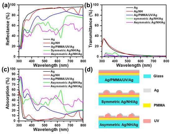 (a) Diffuse reflectance (measured by an ultraviolet–visible spectrometer equipped with an integrating sphere), (b) transmittance spectra and (c) absorption spectra of designed nanostructures at normal incidence: Ag film, Ag/PMMA/UV/Ag film, Ag/NH, symmetric Ag/NH/Ag, and asymmetric Ag/NH/Ag. (d) Schematic illustration of Ag/PMMA/UV/Ag, symmetric Ag/NH/Ag, and asymmetric Ag/NH/Ag.