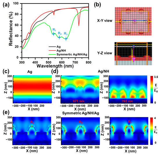 (a) Numerically calculated reflectance spectra of designed nanostructures: Ag, Ag/NH and symmetric Ag/NH/Ag. (b) Schematic illustration of simulation area. Electric field distributions of (c) Ag film at 600 nm, (d) Ag/NH, and (e) symmetric Ag/NH/Ag at resonant wavelengths.