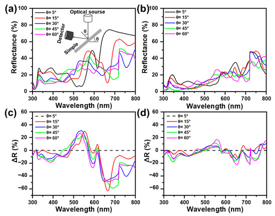 Specular reflectance spectra of (a) symmetric Ag/NH/Ag and (b) asymmetric Ag/NH/Ag measured with different incident angles (θ= 5°, 15°, 30°, 45°, 60°).The differences (ΔR) between the reflectance measured at a 5° incident angle and that at other incident angles (θ= 15°, 30°, 45°, 60°) of (c) symmetric Ag/NH/Ag and (d) asymmetric Ag/NH/Ag.