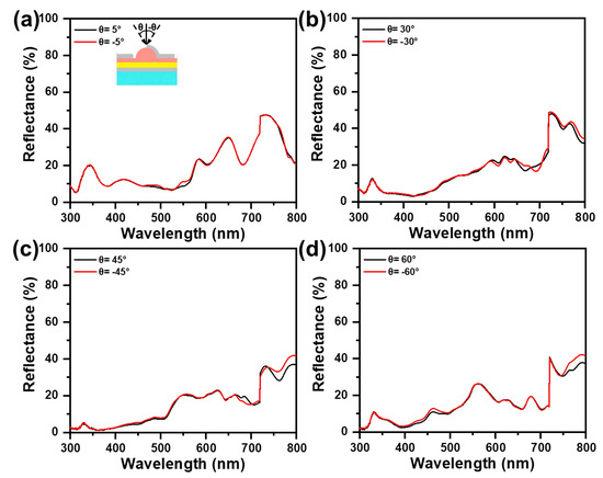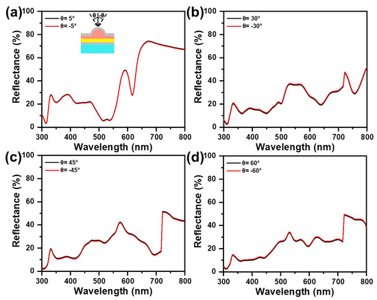 Specular reflectance spectra of asymmetric Ag/NH/Ag, measured with different incident angles of (a) θ = ±5°, (b) θ = ±30°, (c) θ = ± 45°, and (d) θ = ±60°.