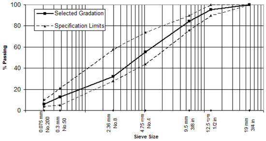 Using dry sieve analysis, the aggregate was sieved and sorted into fractions as retained on each of the following sieves: 19, 12.5, 9.5, 4.75, 2.36, 0.3, 0.075 mm, and a pan. The aggregate gradation curve exhibited in Figure 1 represents the mid-range of gradation for asphalt concrete mix Type III A as defined by SCRB/R9 [23]. The aggregate was blended in the specimen preparation bowl to the necessary weight depending on the specimen geometry and test type. The cylindrical specimen of the Marshall test was 1150 kg, whereas the slab specimen, which was then trimmed to prisms for the OT test, was 10,671, 13,340, and 16,000 kg for the slabs with 40, 50, and 60 mm depths. The blend was homogeneously mixed for two minutes and heated to 150 °C for 2 hrs. in a temperature-controlled oven. The bowl was then balanced, and the calculated amount of asphalt cement, which had also been heated to a temperature of 150–155 °C (corresponding to a binder viscosity of 170 ± 20 c.St), was poured into the mixing bowl.