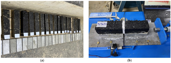 Specimens and AC specimens being tested. (a) PCC and AC specimens; (b) test setup.