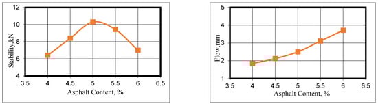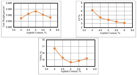 The measurement of resistance to plastic flow was undertaken using the Marshall method, as stipulated by ASTM (D6927) [24]. Marshall stability refers to the peak load a specimen can withstand prior to failure, while Marshall flow describes the total vertical plastic deformation of the specimen. In addition, the specimen’s volumetric characteristics, such as the percentage of air voids (%AV), the void content in mineral aggregate (%VMA), and the voids filled with asphalt (%VFA), were determined based on the specimen’s bulk specific gravity (ASTM-D2726) [25] and the theoretical specific gravity of the mixtures (ASTM-D2041) [26].