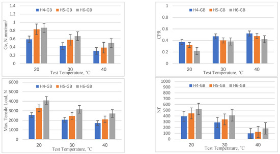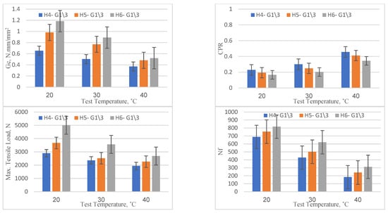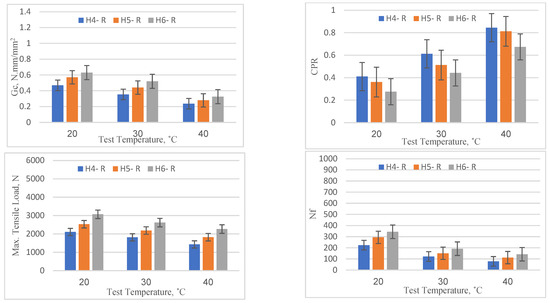 The performance of the reference specimens (without any reinforcement type) under varying overlay thicknesses and temperature conditions was evaluated based on four parameters—Gc, CPR, maximum tensile load at the first load cycle, and Nf—and the results are shown graphically in Figure 9. It is evident that as the overlay thickness increased from 40 mm to 60 mm there was a consistent improvement in all four parameters across all temperature levels (20, 30, and 40 °C). For example, at a temperature of 20 °C, the critical fracture energy (Gc) increased from 0.468 (for 40 mm) to 0.630 (for 60 mm). This showed a performance improvement rate of about 34.5%. Similarly, the number of load cycles to failure (Nf) improved from 224 to 344, suggesting a 53.6% increase in the number of load cycles the overlay could withstand before failure. This clearly suggests that an increase in overlay thickness enhances the performance by improving the overlay’s crack resistance as well as better retarding the initiation of the crack, as indicated by the results of the maximum tensile load. On the other hand, with the increase in temperature, the performance of the reference specimens showed a consistent decline across all thickness levels (40 mm, 50 mm, and 60 mm). For instance, considering the 40 mm overlay, the critical fracture energy (Gc) dropped from 0.468 (at 20 °C) to 0.236 (at 40 °C), showing a performance degradation of about 49.5%. Similarly, the number of load cycles to failure (Nf) declined from 224 to 78, showing a 65.2% decrease in the number of cycles it could endure before failure. Additionally, in comparison to the specimens tested at 20 °C, the maximum tensile load to initiate cracking in the overlay showed reduction rates of 14.12% and 28.37% for specimens tested at 30 °C and 20 °C, respectively. This reduction in performance parameters indicates that higher temperatures can weaken the asphalt material, making it more susceptible to crack initiation and propagation. In conclusion, the data suggest that increasing the thickness of the asphalt overlay can significantly enhance its performance by improving its resistance to crack initiation and propagation. Conversely, high temperatures can deteriorate performance by accelerating crack onset and propagation. Thus, in warmer climates, the asphalt overlay thickness might need to be increased to compensate for the reduction in performance caused by higher temperatures. These findings emphasize the importance of considering local temperature conditions in the design of asphalt overlays.