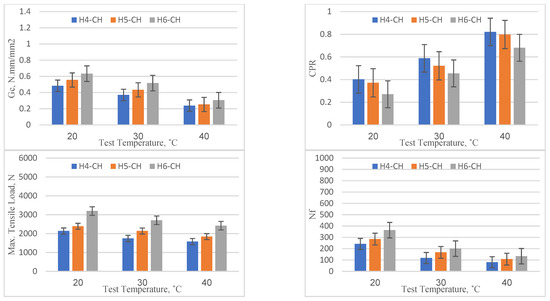 The results of the specimens with chopped fibers are presented in Figure 12. The pattern of performance improvement with an increase in overlay thickness from 40 mm to 60 mm was consistent across all temperature levels (20, 30, and 40 °C), similar to those in previous cases, but to a different extent. For each increment in thickness of 10 mm, the Gc, maximum tensile stress, and Nf increased by a rate of 16.6%, 26.2%, and 29.2%, respectively, whereas the CPR decreased at a rate of 11.1%. These results also denote the high resistance to the onset of reflection cracking and propagation. However, with the increase in temperature, the performance across all thickness levels (40, 50, and 60 mm) declined. For the 40 mm overlay, the critical fracture energy (Gc) reduced from 0.483 (at 20 °C) to 0.238 (at 40 °C), denoting a performance reduction of about 50.7%. Similarly, the number of load cycles to failure (Nf) dropped from 242 to 81, indicating a reduction of approximately 66.5%. This suggests that the benefits of incorporating chopped fibers into the overlay may be offset at higher temperatures due to the increased susceptibility to cracking. However, when comparing the performance of overlays with chopped fibers against the reference specimens, there was a slight improvement across all thickness and temperature levels. At 20 °C and 40 mm thickness, the reference mix had a Gc of 0.468, while the mix with chopped fibers achieved a Gc of 0.483, marking an improvement of around 3.2%. On the other hand, the average CPR value over the investigated thicknesses was approximately similar to those of the reference mix.
