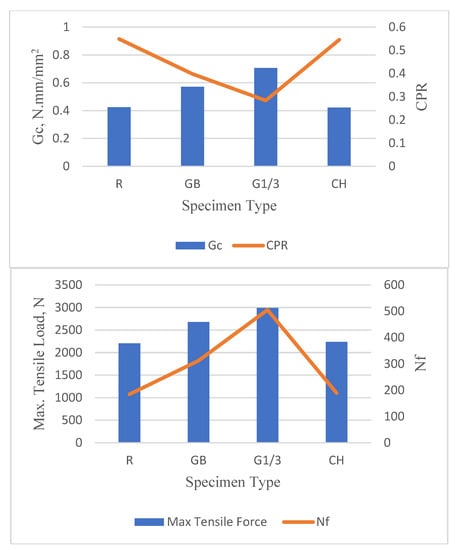 The results of the OT test are presented in the following articles in terms of variable overlay thicknesses (40 mm, 50 mm, and 60 mm) and temperatures (20 °C, 30 °C, and 40 °C) for each type of specimen (i.e., reference mix without any reinforcement type, overlay specimen reinforced by geotextiles located at the bottom, overlay specimen located at one-third of the depth from the bottom, and mixes modified with chopped fibers). In order to best characterize the reflection cracking during the crack initiation phase and propagation phase, four parameters were considered for discussion: Gc, CPR, maximum tensile load, and Nf.