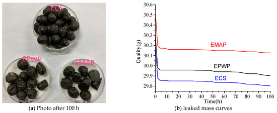 A series of heat treatment steps were executed for EPWP, EMAP, and encapsulated ceramsites (ECS). Approximately 30 g of each particle type was placed in Petri dishes lined with qualitative filter papers and subjected to an oven environment. Initially, the oven was set at 80 °C for 2 h, followed by a temperature adjustment to 180 °C for an additional 2 h. Lastly, the temperature was reverted to 80 °C for a prolonged 96 h duration, culminating in a total baking time of 100 h. The mass of the particles was measured every 2 h, and any changes in mass and potential leakage were meticulously documented.