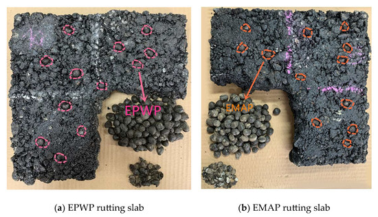 Both EPWP and EMAP rutting slabs were divided into four equal quarters, and one of these quarters was randomly chosen for asphalt dissolution using trichloroethylene. Subsequently, the EPWP and EMAP were extracted from the dissolved quarters, air-dried, and weighed, as visually illustrated in Figure 3. The cumulative mass of the extracted EPWP amounted to 261.24 g, constituting 25.16% of the total EPWP mass. Within this, the mass of crushed EPWP was measured at 15.37 g, corresponding to a crushing ratio of 5.56%. Similarly, the collective mass of the extracted EMAP stood at 247.61 g, accounting for 24.86% of the total EMAP mass. Among these, the mass of crushed EMAP was recorded as 18.15 g, yielding a crushing ratio of 6.83%. While the crushing ratio of EMAP exceeded that of EPWP, both remained below 7%, aligning well with the stipulated asphalt paving requirements.
