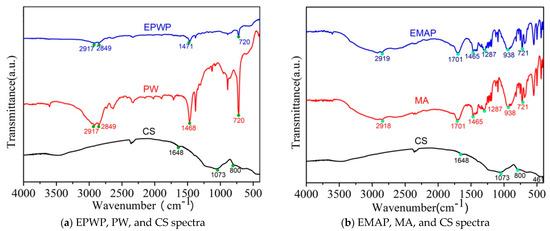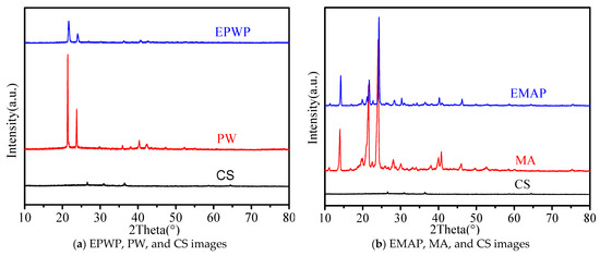As depicted in Figure 6a, PW exhibits more prominent diffractive absorption peaks at 2θ values of 21.39° and 23.77° [46] alongside less intense diffractive absorption peaks at 40.34° and 42.30°. Notably, the characteristic peaks of EPWP appear as a blend of the characteristic peaks of both PW and CS, suggesting the absence of any chemical reaction or the formation of new compounds when PW and CS are combined. EMAP, on the other hand, displays distinctive diffraction absorption peaks at 2θ values of 14.00°, 21.52°, 24.08°, and 40.76° [47,48]. A comparative analysis of the characteristic diffraction peaks of EMAP, MA, and CS reveals that while the positions of these peaks are fundamentally identical, the peak intensities have slightly decreased. This finding implies that no chemical reaction transpired among EMAP, CS, and the encapsulation shell and that no new material has emerged.