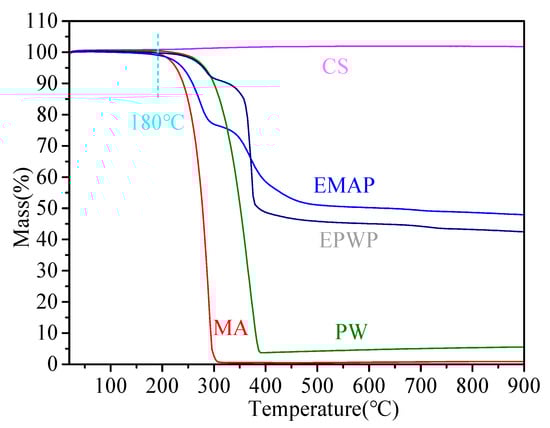 Higher TG decomposition temperatures correspond to improved heat resistance and temperature stability. The TG test outcomes for CS, PW, MA, EPWP, and EMAP are depicted in Figure 7. PW mass declines rapidly between 260 and 380 °C, displaying a maximal TG mass loss of 94.47%. Similarly, MA’s mass experiences a rapid reduction between 200 and 303 °C, with a peak TG mass loss of 99.11%. The variations in quality for EPWP are as follows: from 0 to 155 °C, there is almost no alteration; from 155 °C to 288 °C, the PCM initiates decomposition; and from 288 °C to 379 °C, both the PCM and the encapsulation material undergo complete decomposition. Concerning EMAP, the quality changes are as follows: negligible alteration from 0 to 160 °C, PCM decomposition from 160 °C to 288 °C, and comprehensive decomposition of the PCM and encapsulation material from 288 °C to 390 °C. In both EPWP and EMAP, there is a gradual decline in mass between 288 °C and 357 °C, indicating the decomposition of the encapsulation material. The mass reductions observed in the PCMs are mainly attributed to PCM decomposition, with a secondary contribution from encapsulation material decomposition. EPWP’s maximum TG mass loss is 57.53%, signifying a 36.94% reduction compared to PW. Similarly, EMAP’s peak TG mass loss is 57.50%, demonstrating a reduction of 41.61% compared to MA.