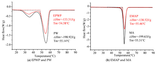Greater ΔHm values indicate higher heat absorption with the same mass of PCMs and better overall performance. The DSC test results for PW, MA, EPWP, and EMAP are depicted in Figure 8. PW exhibits a peak phase change temperature of 55.14 °C and a phase transition enthalpy of 198.92 J/g. For EPWP, the peak phase change temperature is 54.58 °C, and the corresponding phase transition enthalpy is 133.31 J/g. The phase change enthalpy of EPWP accounts for 67.02% of that of PW. MA displays a peak phase change temperature of 55.31 °C along with a phase transition enthalpy of 199.63 J/g. For EMAP, its peak phase change temperature is 55.46 °C, accompanied by a phase transition enthalpy of 138.52 J/g. The phase change enthalpy of EMAP is 69.39% of that of MA. Thus, the phase change enthalpies of both EPWP and EMAP are notably high, satisfying the requirements for energy storage materials in asphalt pavement applications.
