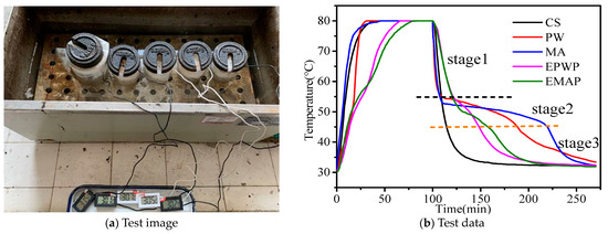As depicted in Figure 9b, the temperature rise of MA, CS, and PW occurs more rapidly, while the rise of PCMs is comparatively slower. Before reaching 60 °C, EMAP experiences a quicker temperature rise; after 60 °C, EPWP’s temperature ascends more rapidly. The temperature drop of CS is the most rapid, reaching the lower end of the test temperature quickly. Both the PCMs and pure PCMs exhibit three distinct temperature drop stages.