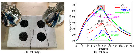 Under equal heat input, lower maximum temperatures indicate better temperature regulation. As depicted in Figure 10b, MS exhibits the most rapid temperature rise, followed by CSMS, EMAPMS, and EPWPMS. MS reaches a peak temperature of 69.6 °C, CSMS of 68.07 °C, EMAPMS of 64.8 °C, and EPWPMS of 63 °C. The maximum temperature of EPWPMS is 6.6 °C lower than that of MS, EMAPMS is 4.8 °C lower than MS, and CSMS is 1.53 °C lower than MS. Consequently, EPWPMS demonstrates the most effective temperature regulation, followed by EMAPMS and CSMS, which also display some degree of temperature regulation.