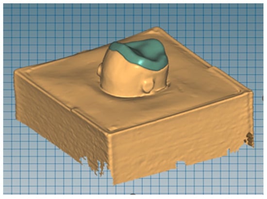 The first abutment was digitized using the Map 300 digital 3D scanner (Amann Girbach AG, Koblach, Austria). Then, with the help of Ceramill Mind (Amann Girbach AG, Koblach, Austria), designs for occlusal veneers with thicknesses of 1, 1.5, and 2 mm were prepared (Figure 1). Their thickness was uniform in every part of the restoration. Four different materials were used for the restoration: leucite ceramics, lithium disilicate ceramics, hybrid ceramics, and zirconium oxide ceramics. A total of 30 veneers were made of each material, 10 for each of the three thicknesses tested. Restorations made of leucite ceramic IPS Empress Esthetic (Ivoclar Vivadent, Schaan, Lichtenstein) and lithium disilicate IPS e.max Press (Ivoclar Vivadent, Schaan, Lichtenstein) were made by pressing. The designed restorations were milled in Ceramill Wax (Amann Girbach AG, Koblach, Austria) in a Ceramill Motion milling machine (Amann Girbach AG, Koblach, Austria). The wax patterns were embedded in molds in the refractory mass Bellavest SH (Bego, Bremen, Germany) + BegoSol HE (Bego, Bremen, Germany). Then, in a Programat Ep 3000 (Ivoclar Vivadent, Schaan, Lichtenstein) oven, wax was fired, and ceramic material was pressed. Veneers made of transparent zirconium oxide 4Y-TPZ Ceramill Zolid HT (Amann Girbach AG, Koblach, Austria) and Vita Enamic (Vita Zhanfabrik, Bad Säckigen, Germany) hybrid ceramics were made by milling. The designed reconstructions were milled from prefabricated blocks in a Ceramill Motion (Amann Girbach AG, Koblach, Austria) milling machine in a 1:1 scale.