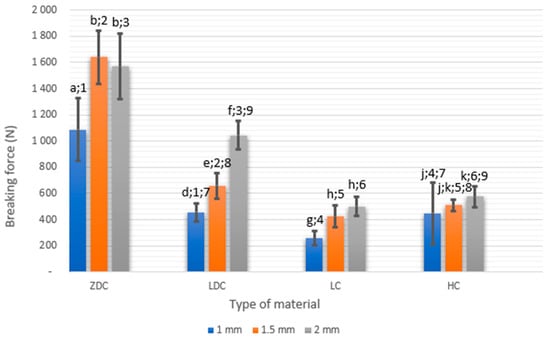 Comparison of fracture resistance (N) of occlusal veneers depending on the material used. Bars with different letters and digits have different statistical significance (p < 0.05). Letters are for comparison of same material with different thicknesses, digits are for comparison of same thicknesses between different materials.