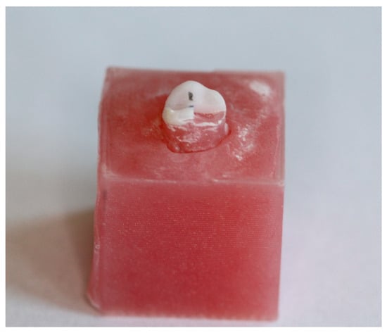 The study was carried out in the universal testing machine Z020 (Zwick/Roell, Ulm, Germany) at the University Material Research Laboratory of the Medical University of Łódź. The samples were placed in a specially prepared holder providing forces on the sample at an angle of 15° BL []. The mutual angle of the premolar teeth axis LB is 15 degrees: of the premolars of the maxilla (6 degrees) and mandible (9 degrees). Therefore, the tooth was positioned relative to the head at this angle to simulate loading conditions similar to those in the mouth. The pressure was exerted by a metal head ending with a ball with a diameter of 3.5 mm. The diameter of the metal ball of the head is due to the width of the functional cusps of the opposing teeth (Figure 2). The head speed has been set at 1 mm/min. The results of the study were recorded in the form of graphs of the force acting on the samples depending on the displacement of the head (N). The test was recorded, and the moment of fracture of the sample on the recording was compared with a graph in order to read the value of the destructive force of the sample.