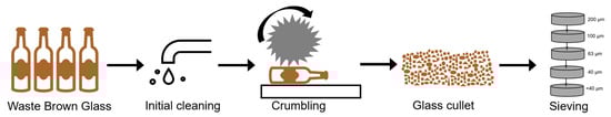 Fly ash from Skawina Power Plant was used as a primary material for the geopolymers synthesis. A commonly available quartz river sand (Swiętochłowice, Poland) was applied as an aggregate in the geopolymer matrix. Waste cullet glass of brown bottles after initial cleaning and crushing, used as a partial replacement of fly ash in geopolymer composites, was delivered by Grabowski Import Export Company (Sędziszowa, Poland). The glass cullet was sieved through a set of sieves with mesh sizes of 200 μm, 100 μm, 63 μm, and 40 μm to determine the influence of various ranges of waste glass particle size on the properties of the composites. As a result, there were six various ranges of particle sizes, such as 0.1–1200 μm (unsorted waste glass), 200–1200 μm, 100–250 μm, 63–120 μm, and 40–63 μm, 0.1–40 μm. The cullet was not subjected to additional cleaning before the application due to economic and environmental reasons, including reducing the cost of geopolymers production, as well as water and electricity savings. The schematic of the waste glass preparation process is shown in Figure 1.