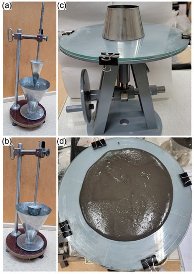 Consistency of geopolymers mortars determined by (a,b) the Novikov cone method and (c,d) the flow table test.