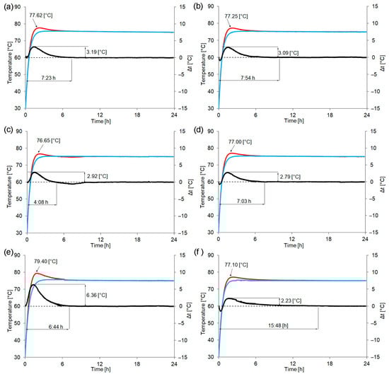 Thermal effects of (a) REF, (b) REF without sand, (c) 20_0.1–1200, (d) 20_200–1200, (e) 20_0.1–40, and (f) 20_0.1–1200 registered using a negative temperature coefficient thermistor device for fresh geopolymer mortars during the geopolymerization process (red curve), after 48 h of curing (blue curve), and the difference between these two curves (black curve).