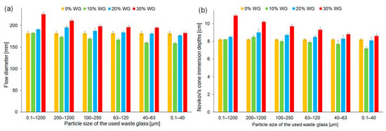 The consistency of fresh geopolymer mortars depending on the share and the fraction of waste glass particle size determined by (a) the flow table test and (b) the Novikov cone method.
