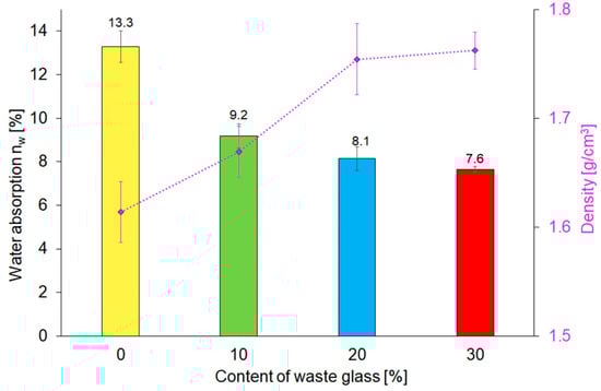 Water absorption is an important feature of construction materials, which shows the resistance of concrete materials to sulphate, chloride ions, carbonation, and freeze-thaw cycles [66]. Water absorption is strongly connected to pore size and volume in the investigated materials [67]. Figure 6 presents the results of the water absorption and density test of reference geopolymers and composites containing unsorted waste glass, corresponding to the particle size of 0.1–1200 µm. There was a strong dependence between the share of waste glass in geopolymers and their water absorption. As predicted, the water absorption decreases with the increase of waste glass share in geopolymers. The reason for this is the water absorption of waste glass, which is close to zero [68,69]. Furthermore, the addition of waste glass to the geopolymer matrix resulted in higher density as compared to the reference material.