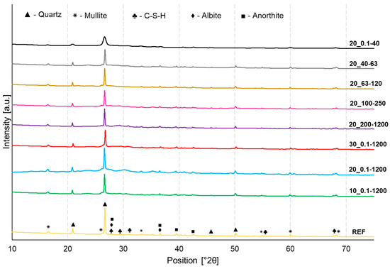 In order to assess the influence of waste glass on the mineralogical composition of geopolymers containing different shares and sizes of the fraction of the waste glass addition, their XRD patterns were compared (Figure 7). The qualitative analysis revealed the following phases: quartz (SiO2, ref. code: 01-075-8320), mullite (Al6Si2O13, 01-082-1237), C-S-H as Rosenhanite (Ca3 (Si3O8(OH)2, ref. code: 00-029-0378), albite (NaAlSi3O8, ref. code: 01-071-1150), and anorthite (CaAl2Si2O8, ref. code: 04-013-2357). In general, the peak locations of all investigated samples had almost no difference, pointing out that they consisted of the same phases. However, the XRD peaks of samples manufactured using waste glass addition had lower intensity as compared to the reference material. Similarly, the smaller the particle size, the lower the intensity of the peaks, which is especially evident for the sample containing the smallest particle size (20_0.1–40). This effect can be attributed to the decline in the degree of crystallinity. The appearance of the hump on the diffractogram at position 15–35° 2θ indicates the presence of an amorphous phase, which was identified as a C-S-H compound. Moreover, sharp diffraction peaks observed in particular positions on the diagram as a result of the use of X-rays were assigned to crystalline phases [70]. Albite and anorthite belong to plagioclase feldspar minerals, and due to their high stability, they can serve as a filler or reinforcing material [71].