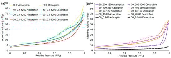 The nitrogen adsorption–desorption isotherms of samples containing various shares and particle sizes of waste glass are presented in Figure 8a,b, respectively. According to the IUPAC (International Union of Pure and Applied Chemistry) classification, all obtained isotherms can be categorized as type IV isotherms with H3 hysteresis loops [72]. In this type of isotherm, a hysteresis loop occurs as a result of the filling or evacuating of mesopores (pores with a diameter of 2–50 nm) via capillary condensation [73,74].